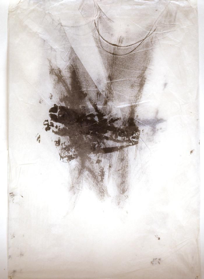 The body, reconstructed from the imprint of a torso from behind, is imprinted by ink onto old scraps of torn fabric. Then, as it dissolves, this body inscribes the shadow of what it once was, the ephemeral trace of its passage and its annihilation, and, hesitating on the threshold to be crossed, leaves the viewer to decide the choice of its destiny.