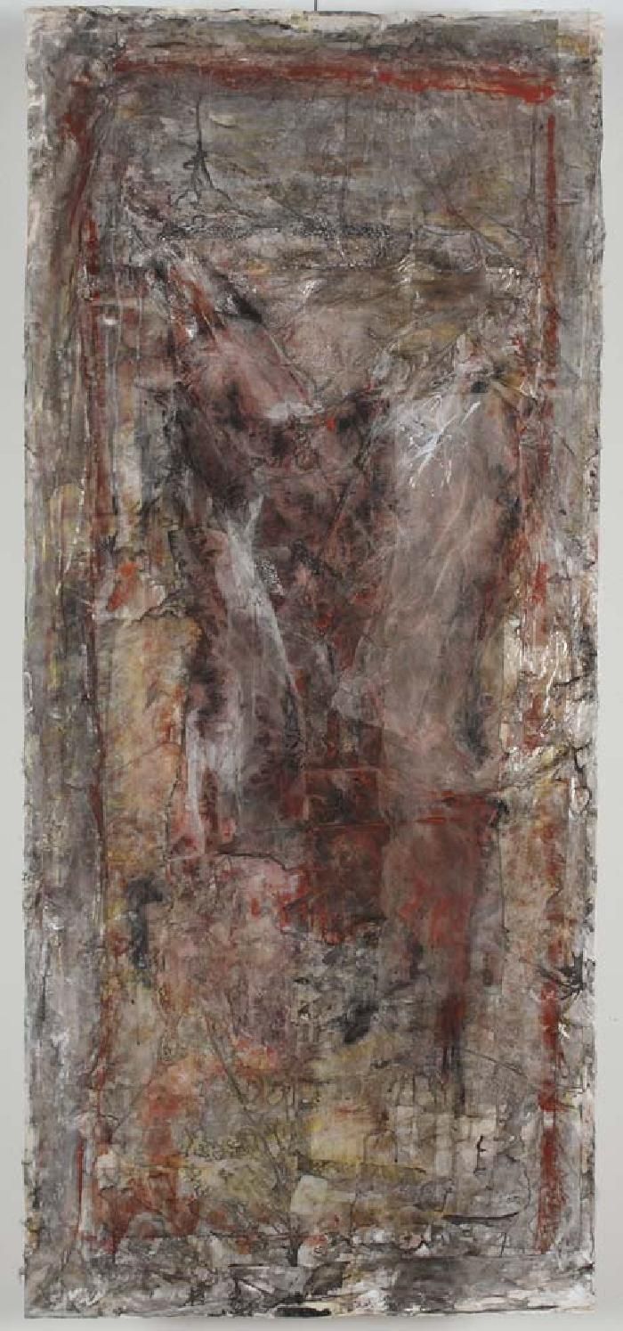 Evoquant des embaumements antiques, des mises en terres étrangères, des inhumations sans tombeau, des corps sans sépulture, des carcasses noircies, brûlées, les formes se répondent d'œuvre en œuvre, sortant des draps, â force de superpositions, ou pénétrant, tournant le dos au spectateur, dans un monde plat et souple, sombre et blafard, rugueux et mou.